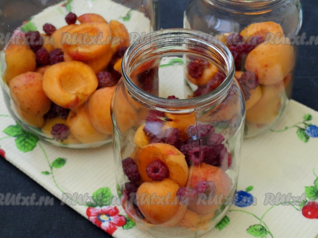 В чистые стерильные банки разложить абрикосы и малину.