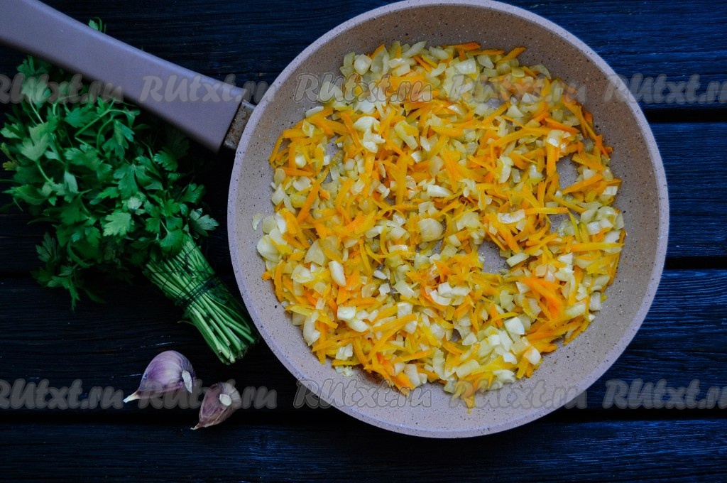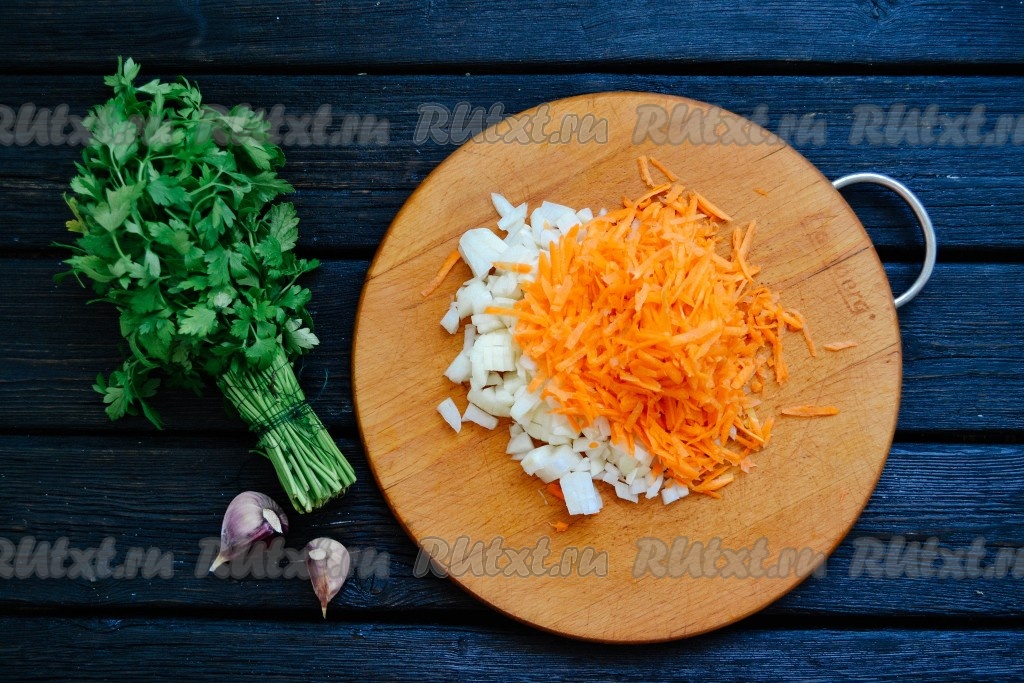 Очистить лук и морковь. Лук нарезать мелкими кубиками, а морковь натереть на средней терке.