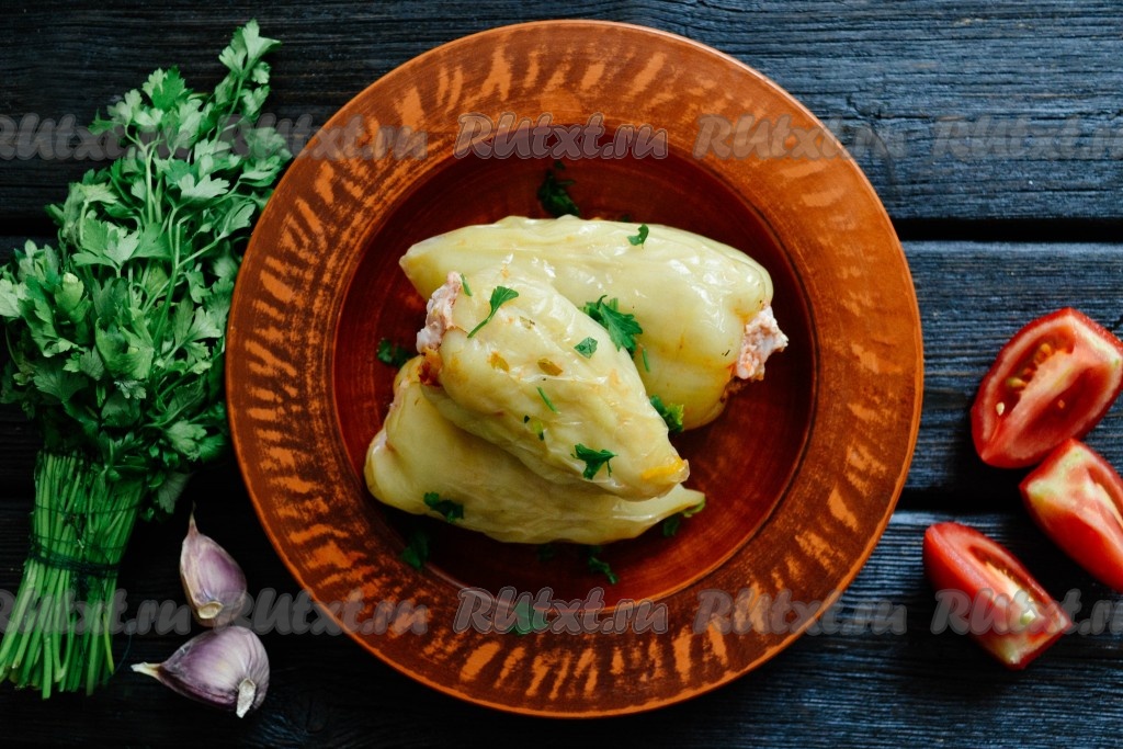 Вкусные, сочные, ароматные перцы, фаршированные курицей и рисом, выложить на блюдо, посыпать нарезанной петрушкой и в горячем виде подать на стол.
