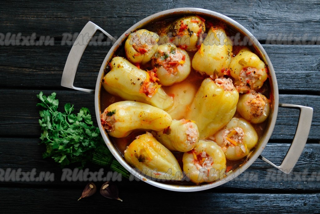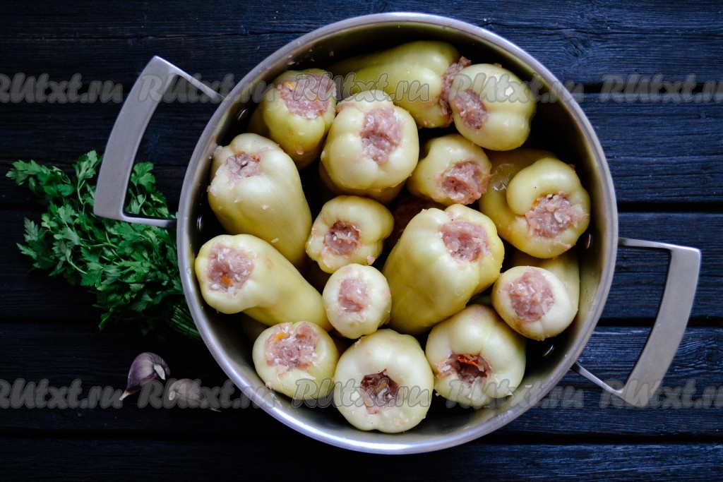 Аналогично сверху выставить в кастрюлю второй ряд фаршированных перцев.