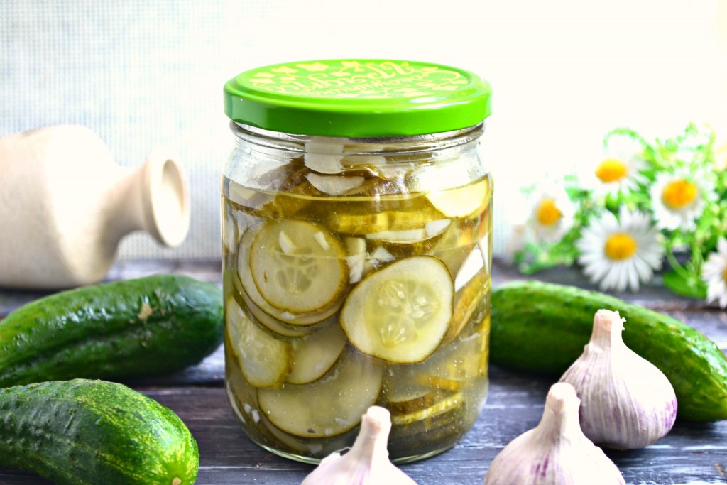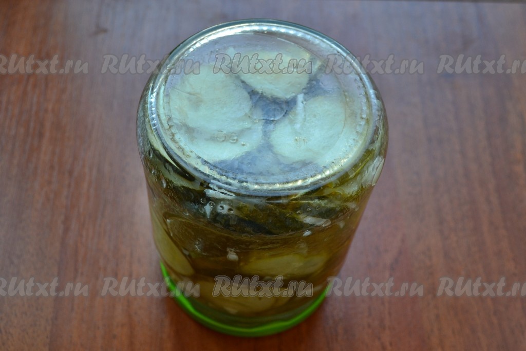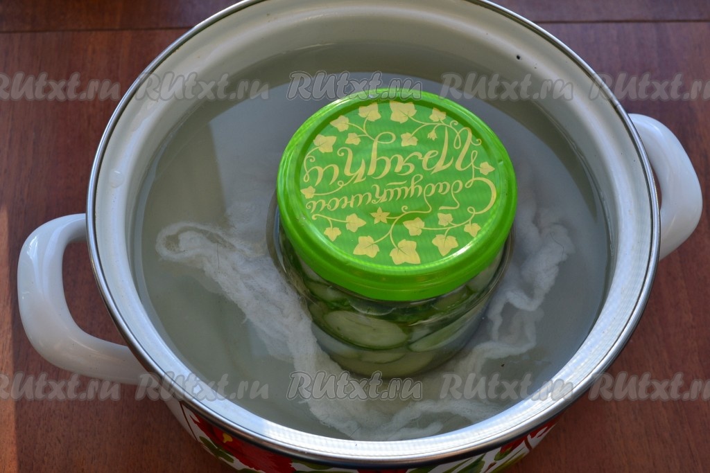 Поставить кастрюлю на огонь, довести воду до кипения, затем огонь уменьшить до среднего и стерилизовать салат из огурцов с чесноком 15 минут от момента закипания воды. Банку закатать, перевернуть.