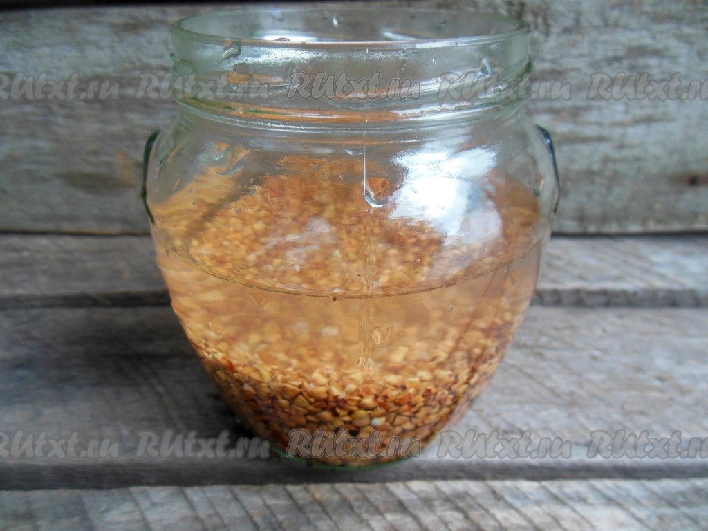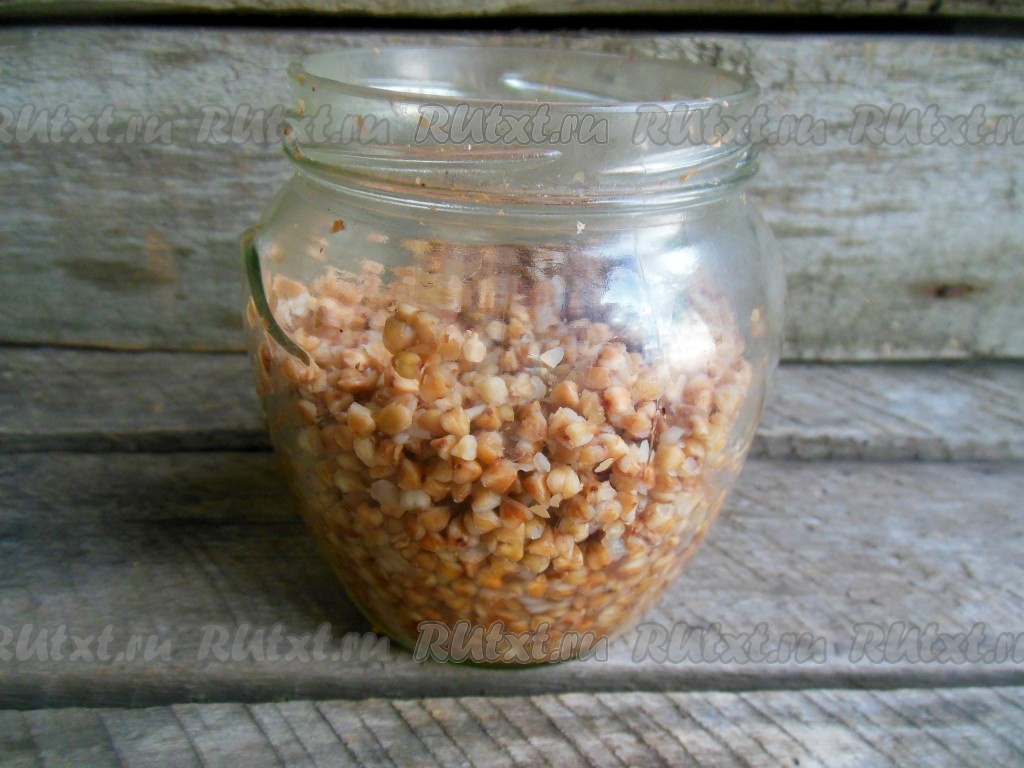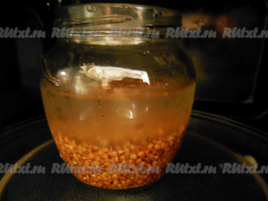 В банку (я использую пол-литровую банку) насыпьте промытую гречку, добавьте холодную воду и поставьте в микроволновку (крышкой не накрывайте).