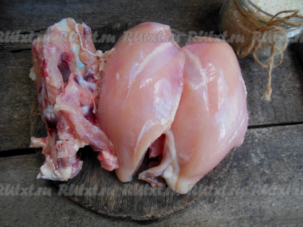 Фарш для этого блюда можно взять покупной или приготовить его из куриного мяса. Я готовила фарш из куриной грудки, отделив мясо от костяного каркаса (из кости можно сварить первое блюдо).
