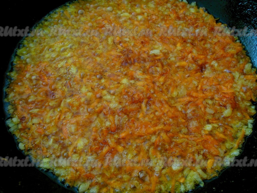 Обжарьте морковку с луком, время от времени помешивая, на растительного масле на среднем огне до золотистого цвета.