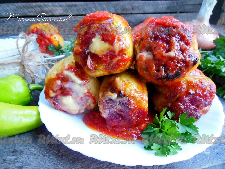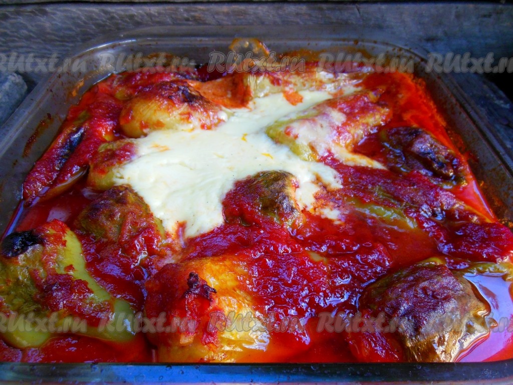 В глубокую форму выложите фаршированные перцы в один слой, сверху залейте приготовленной томатной подливкой.