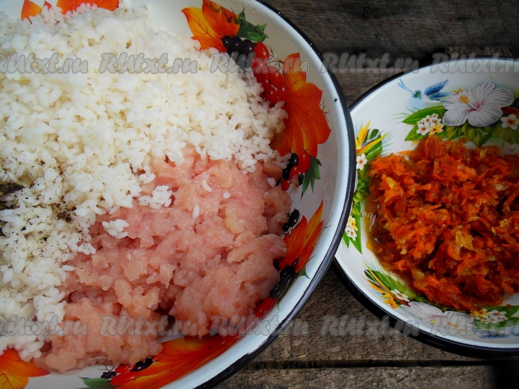 Соедините сваренный до полуготовности рис, черный молотый перец, соль и фарш, добавьте остывшие 3-4 столовые ложки моркови, обжаренной с луком, которые мы откладывали, хорошо перемешайте. Начинка для фарширования перцев готова.