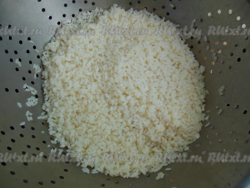 Залейте рис кипящей водой, подсолите и варите около 5-7 минут с момента закипания (до полуготовности риса). Затем откиньте рис на дуршлаг и промойте. Оставьте до полного остывания.
