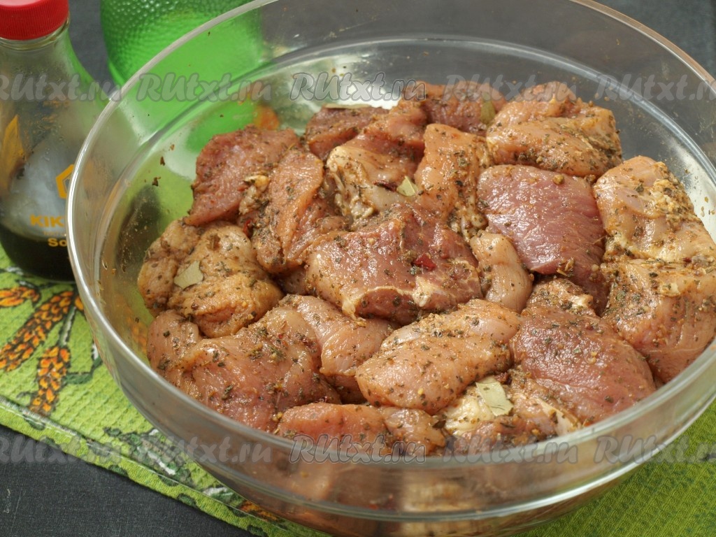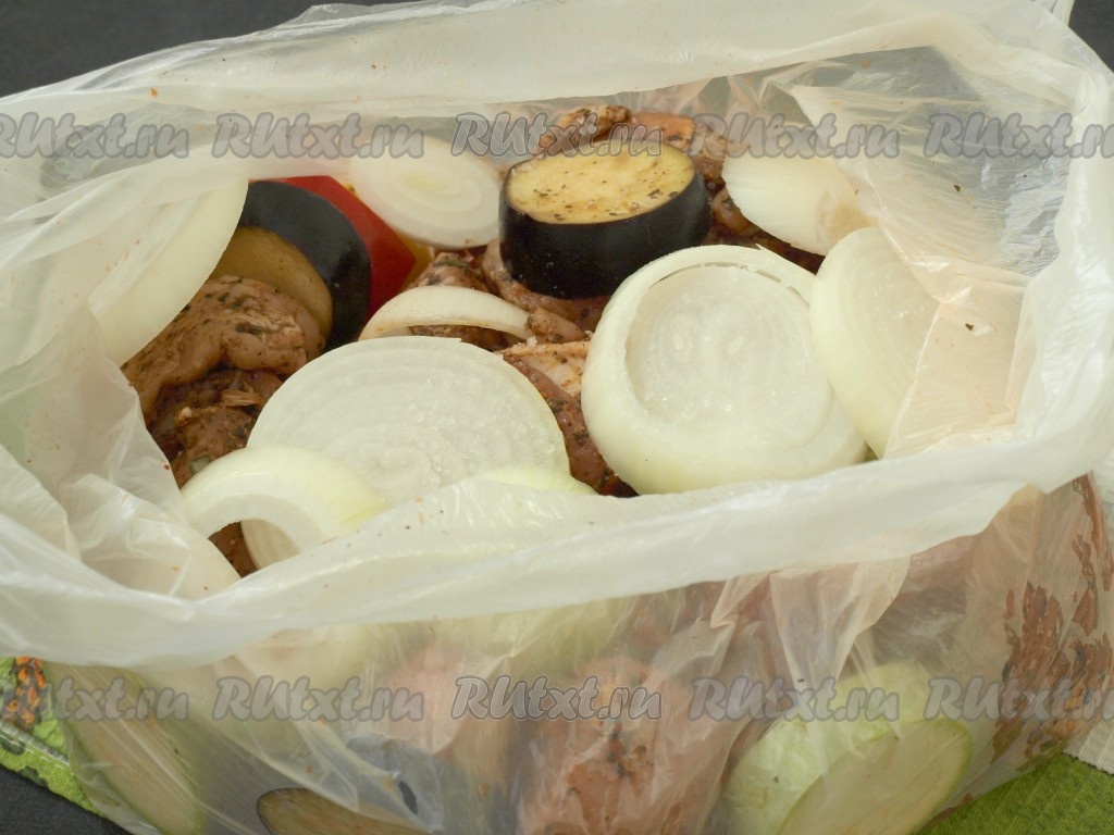 Для того чтобы мясо и овощи хорошо промариновались, их лучше пересыпать в целлофановый пакет, завязать и хорошо встряхнуть. Оставить пакет в холодильнике на 3-4 часа.