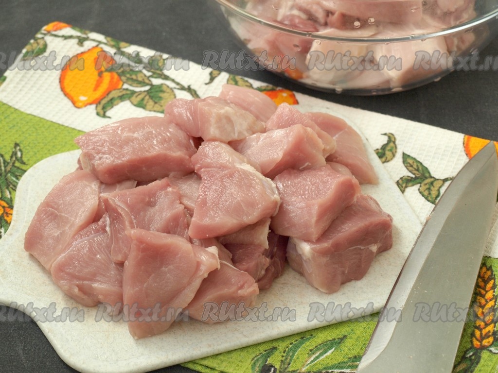 Мякоть свинины, которую я брала для шашлыка, называют "яблочко". Мясо следует промыть и зачистить, затем обсушить и нарезать на кусочки массой 35-40 грамм.