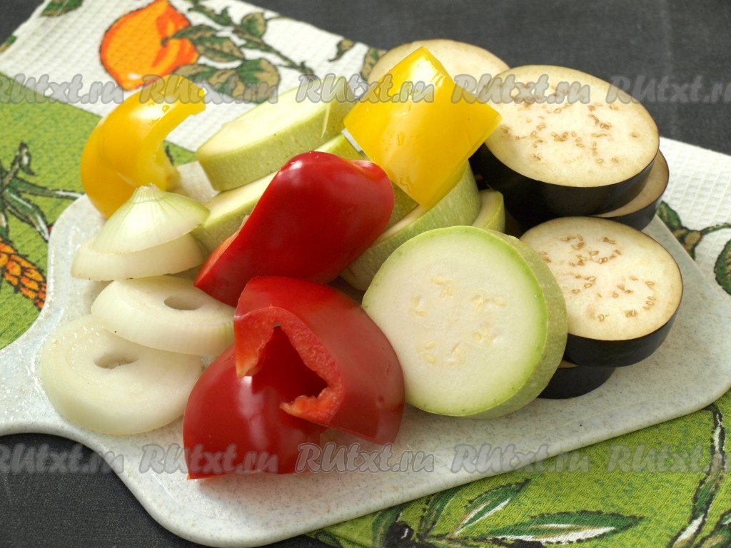 Овощи вымыть. Перец очистить от семян и нарезать удобными кусочками, кабачки и баклажаны нарезать кружочками толщиной 7-8 мм, лук - кольцами такой же толщины.