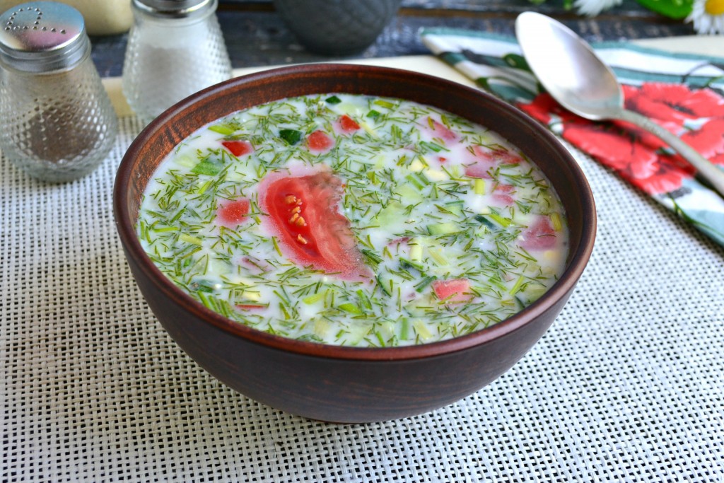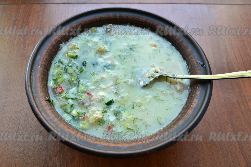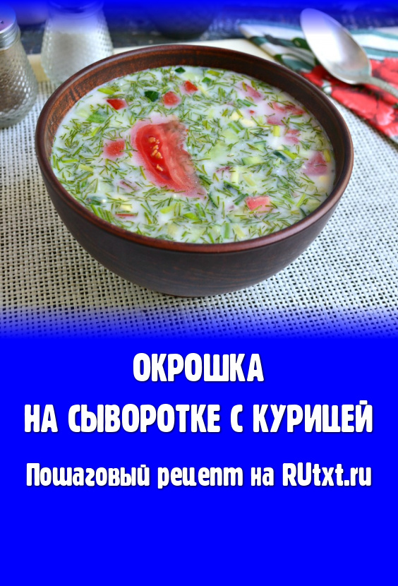 Очень вкусную, сытную окрошку, приготовленную на сыворотке с курицей, охладить и можно подавать к столу.