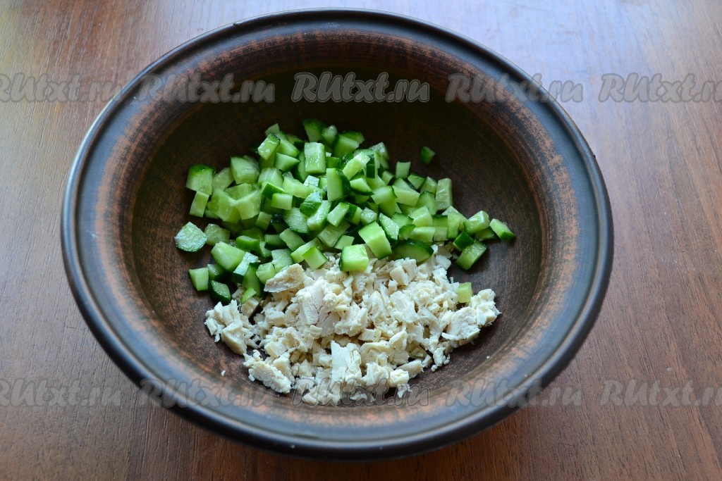 Заранее отварить кусочки курицы в течение 25-30 минут после закипания воды, в процессе варки воду подсолить. Сварить вкрутую яйца (после начала кипения воды варить минут 9-10). Картошку вымыть и сварить в кожуре до готовности (после закипания воды варить на небольшом огне минут 25-30). Затем картошку и яйца остудить, а непосредственно перед приготовлением окрошки очистить. Куриному мясу тоже дать полностью остыть, если есть косточки, удалить их. Для окрошки потребуется 150 грамм куриного мяса. Для приготовления окрошки нужно нарезать курицу на небольшие кусочки, свежие огурчики нарезать на маленькие кубики, сложить в объёмную миску.