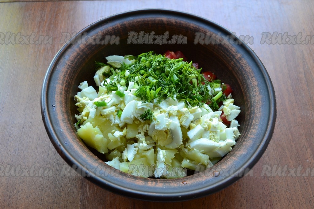 Сюда же добавить мелко нарезанную зелень и рубленные варёные яйца.