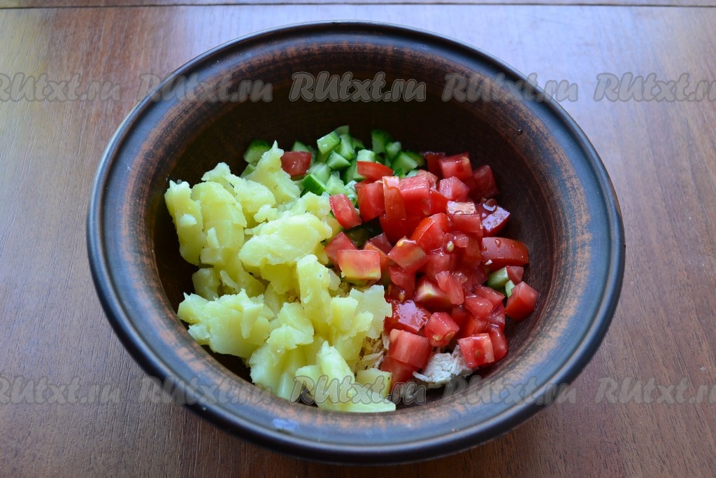 Добавить к мясу и огурцами нарезанный на маленькие кубики отварной картофель. Если вы, как и я, готовите окрошку со свежими помидорами, тогда тоже нарежьте их на небольшие кубики и выложите в миску.