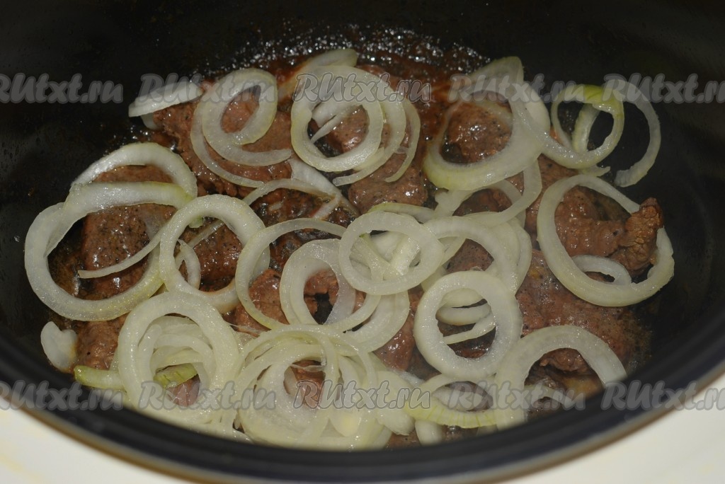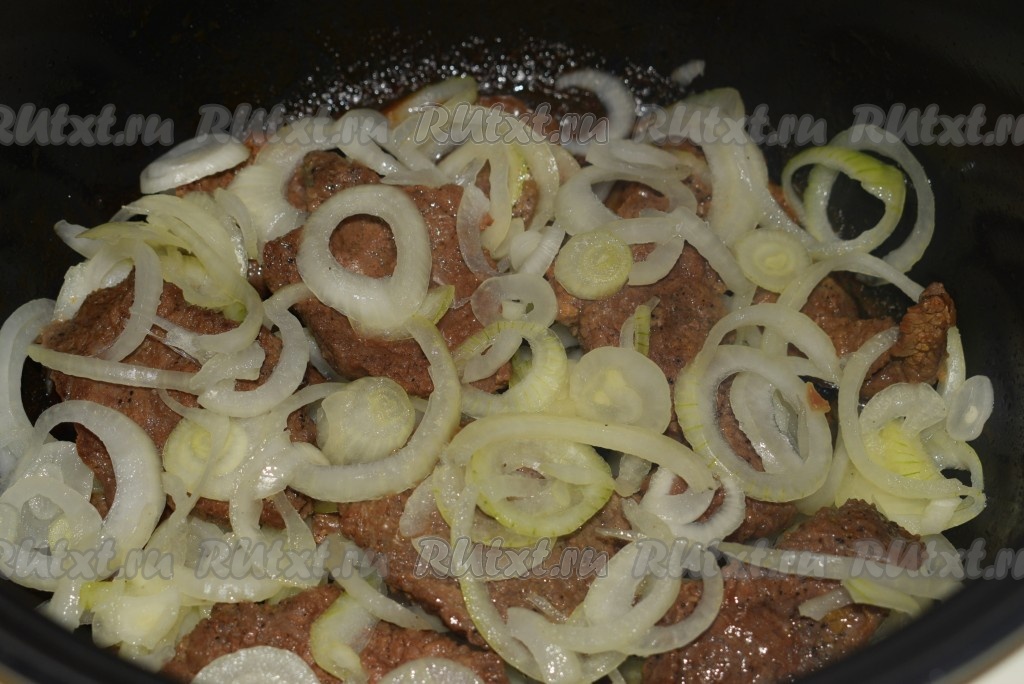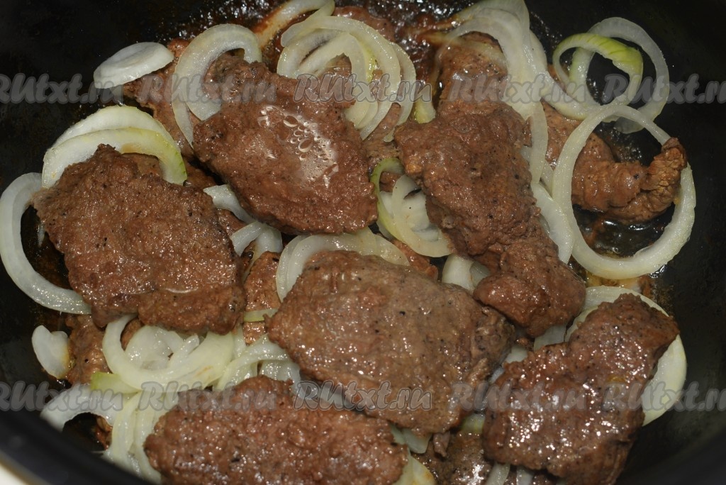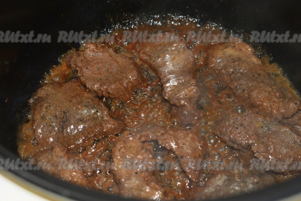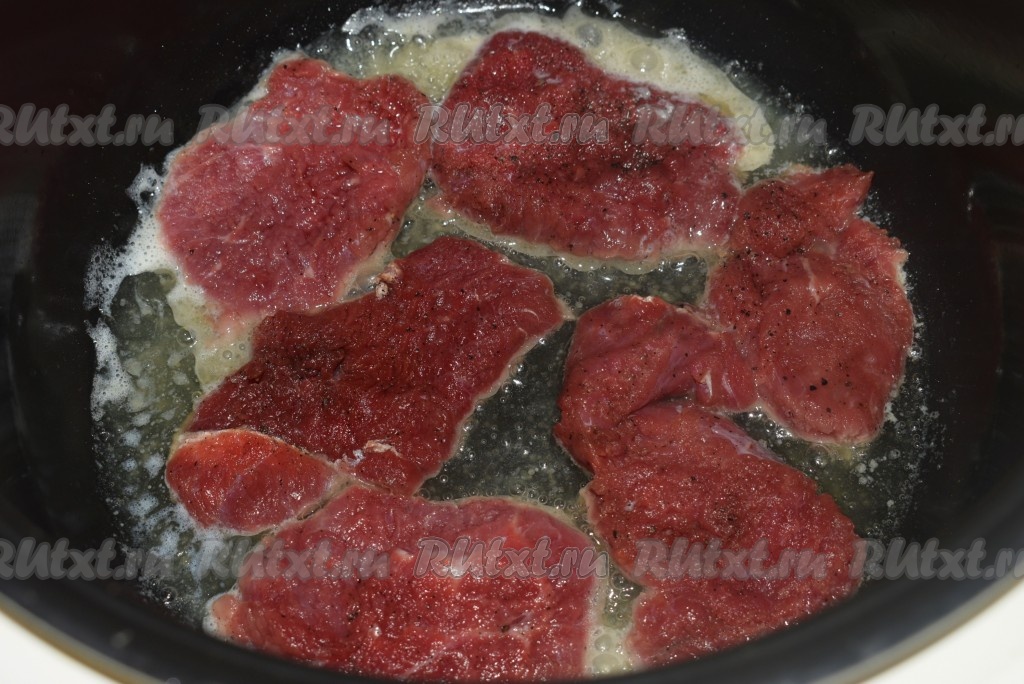 Обжарить отбивные из говядины с двух сторон до золотистой корочки, выкладывая их в один слой на дно чаши мультиварки (всё мясо сразу обжарить в мультиварке не получится, поэтому обжариваем в несколько приемов).