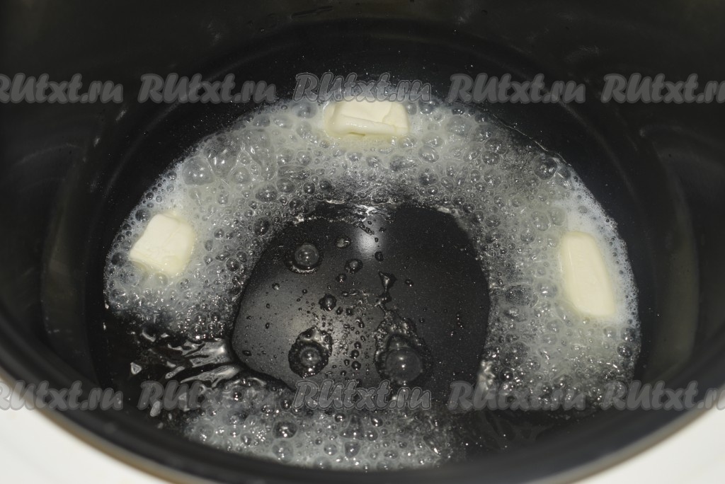 Разогреть мультиварку на режиме "Жарка", выбрав вид продукта "Мясо". В чашу мультиварки выложить сливочное масло и растопить его.