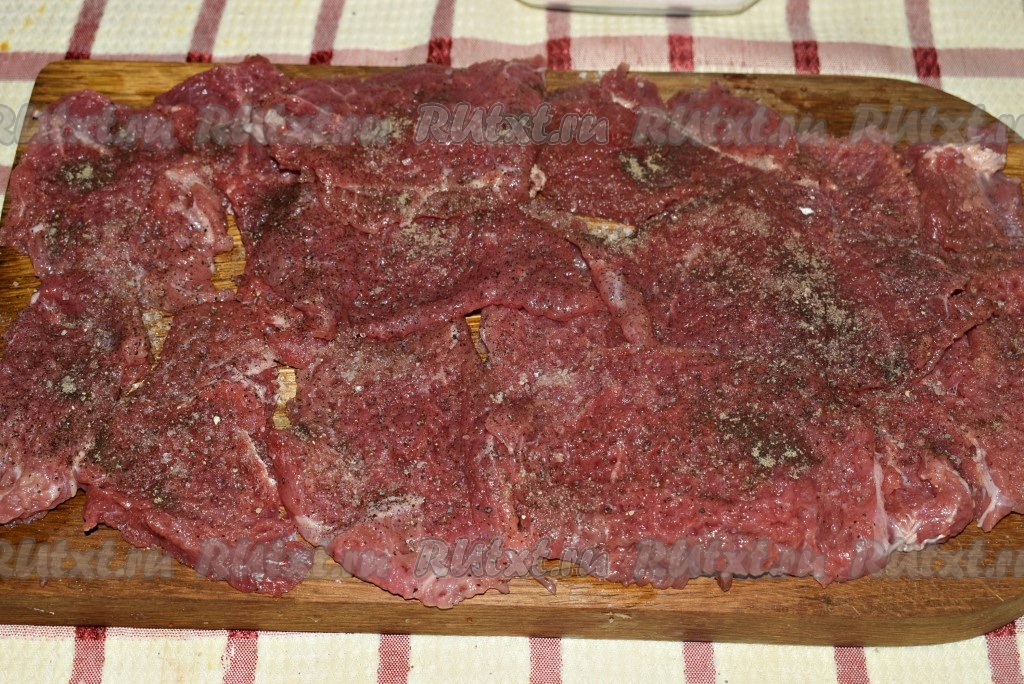 Посолить, поперчить мясо с 2-х сторон и дать просолиться в течение 15-20 минут.
