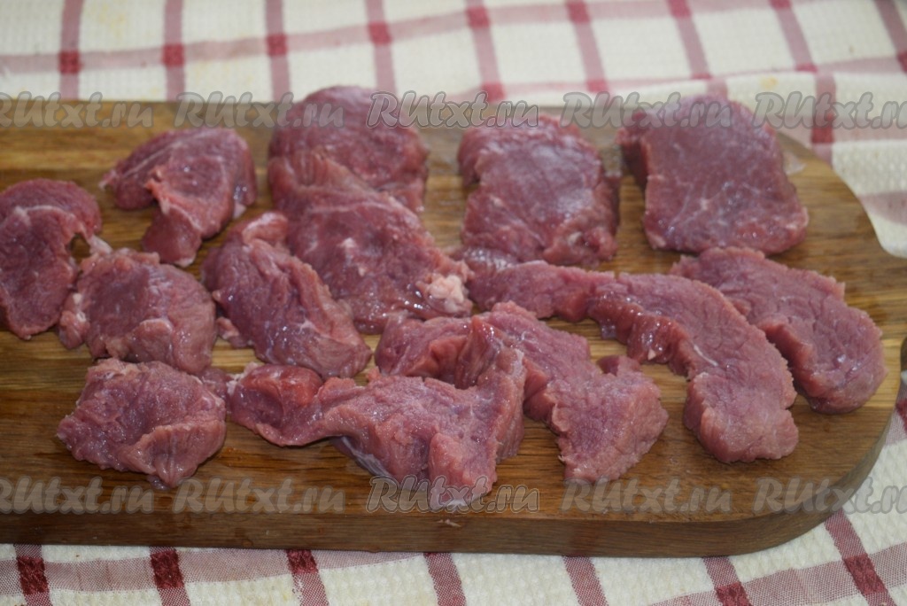 Мякоть говядины нарезать на средние кусочки.