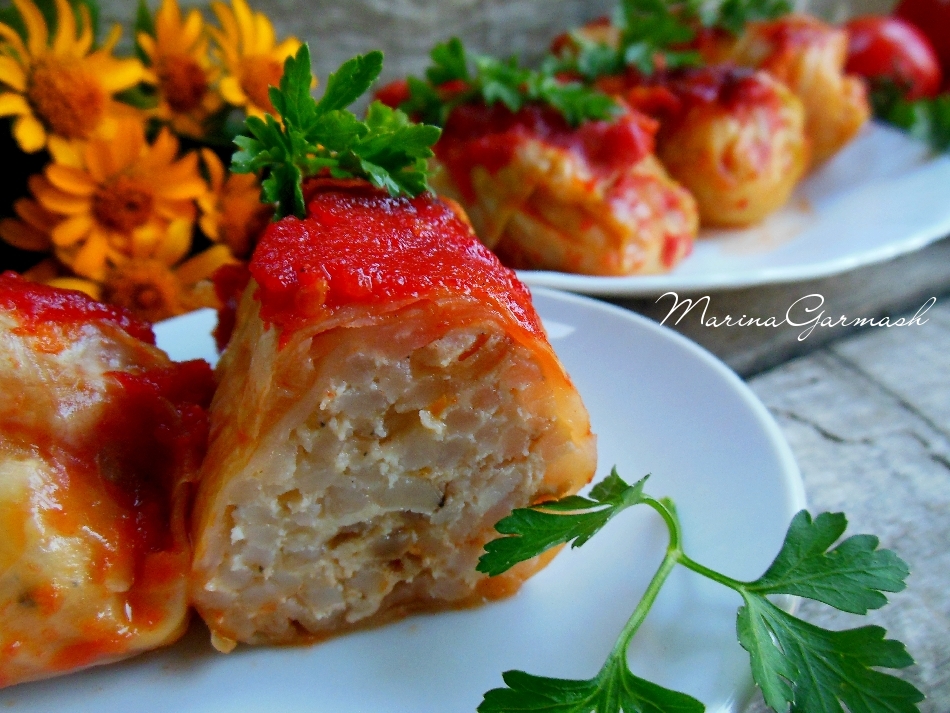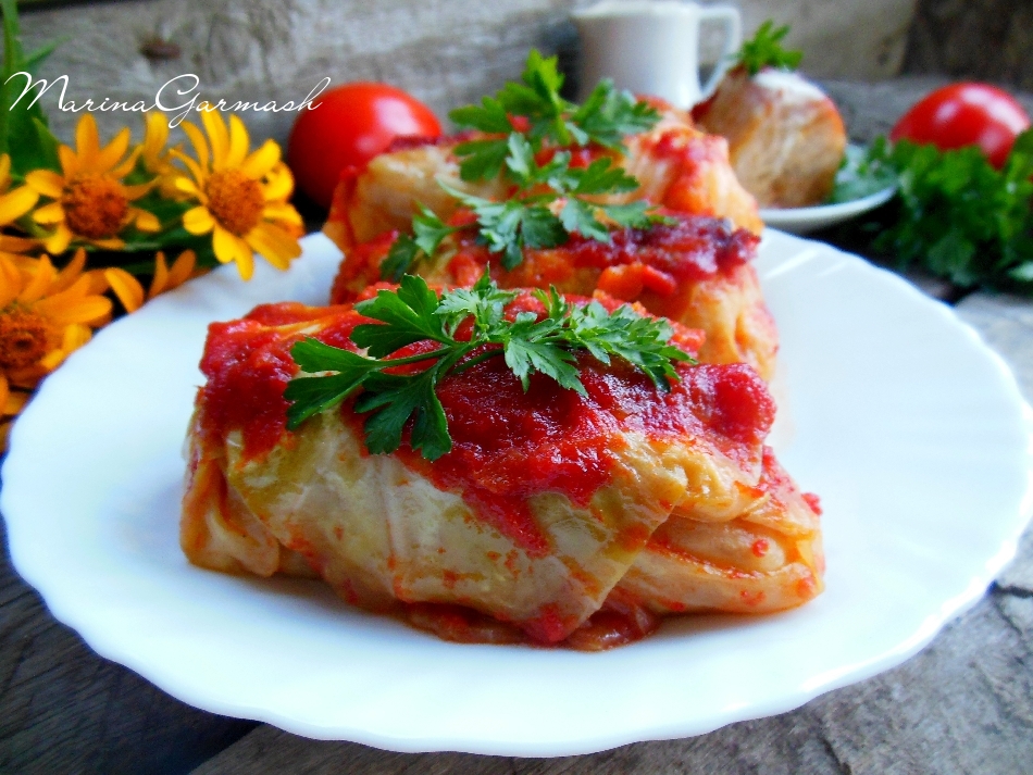 Сегодня хочу поделиться своим фирменным блюдом. Голубцы с начинкой из фарша и риса, запечённые в томатно-сметанном соусе в духовке, очень любят не только в моей семье, но их с нетерпением ждут и гости, приходя в наш дом. Поэтому я часто готовлю это блюдо. Предлагаю и вам попробовать, очень вкусно, особенно на второй день, когда голубцы как следует пропитаются.