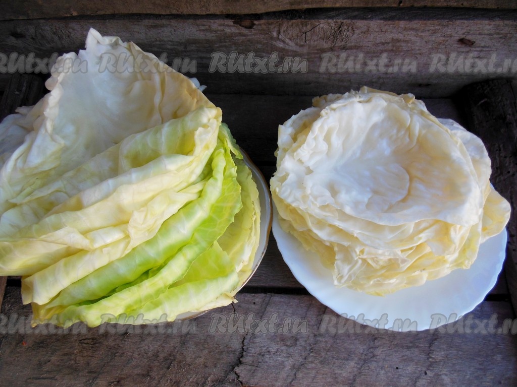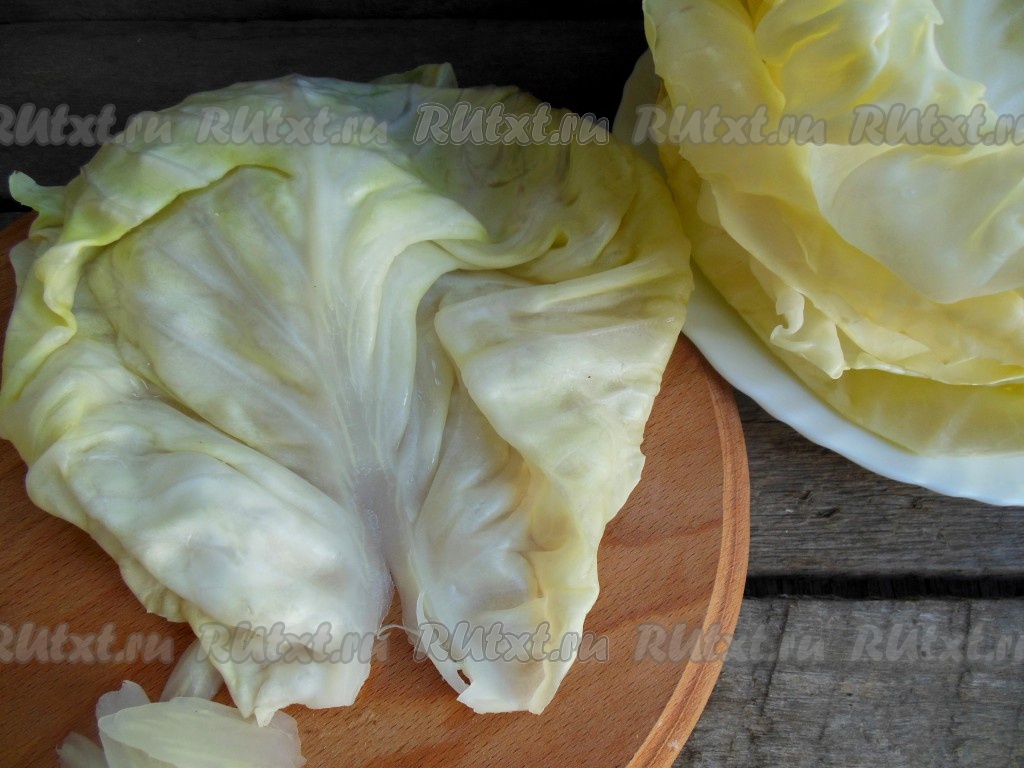С кочана капусты удалите верхние листочки, при помощи острого ножа вырежьте кочерыжку. Для того чтобы листы капусты стали мягкими, можно отварить капусту в кипящей воде, снимая мягкие листы. Я решила кочан капусты не отваривать, а воспользоваться помощью микроволновки.