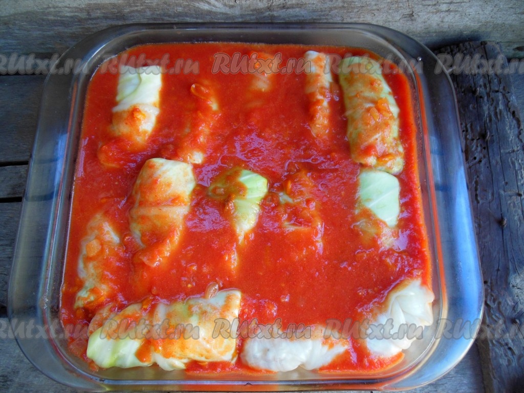Голубцы с начинкой из фарша и риса залейте сверху томатно-сметанным соусом и отправьте в разогретую духовку.