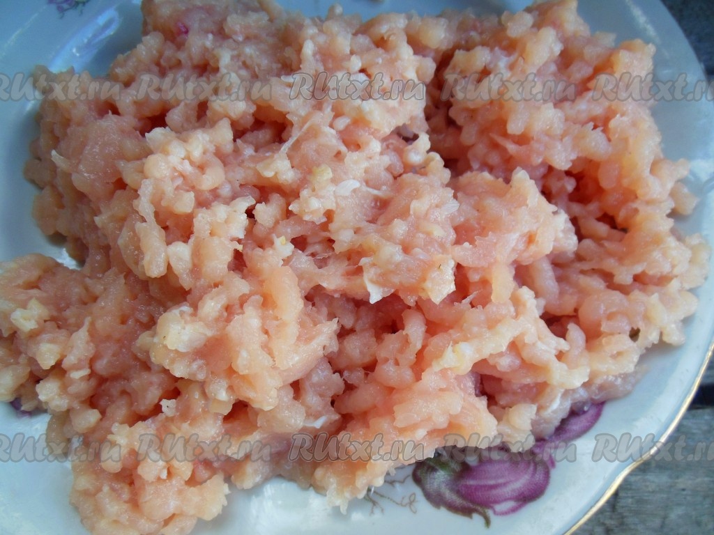 Куриное филе (или другое мясо) промойте, обсушите, нарежьте на небольшие кусочки и пропустите через мясорубку. При желании, можно взять и покупной фарш.