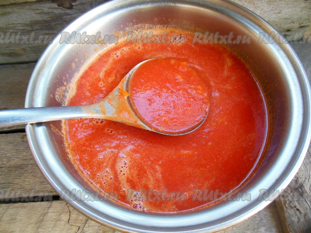 Для приготовления томатно-сметанного соуса на сковороду с оставшимися обжаренными овощами выложите томатную пасту, соль, чёрный молотый перец, влейте воду, перемешайте, доведите до кипения, уменьшите огонь до среднего и проварите 2-3 минуты, попробуйте на вкус, если нужно, добавьте сахар, перемешайте. Выложите сметану, перемешайте и снова доведите до кипения. Как только томатно-сметанный соус закипит, снимите с плиты.
