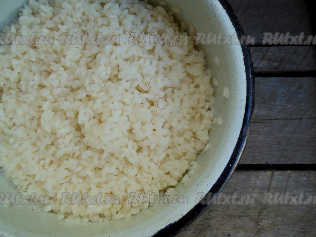 Рис промойте, выложите в кипящую воду, после закипания воды огонь уменьшите, добавьте соль и варите до полуготовности (минут 15). Затем рис выложите в дуршлаг, промойте, дайте полностью стечь воде и остудите.