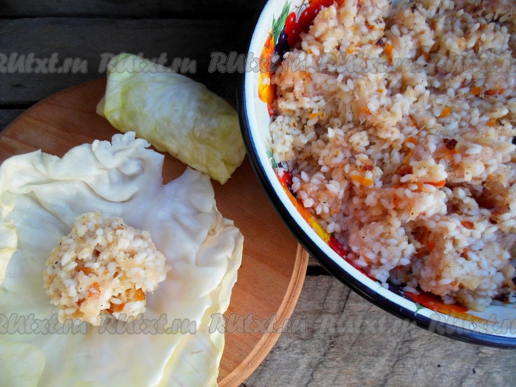 В центр каждого подготовленного листа капусты выложите 1-1,5 столовых ложки начинки. Для формирования голубца часть листа, расположенного ближе к начинке, подверните на начинку, затем подверните боковые края листа и, начиная с подвёрнутой стороны, сверните лист в рулетик, получится голубец.