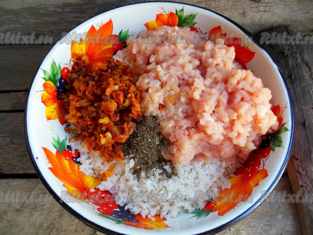 В отдельную тарелку к остывшему рису добавьте обжаренные овощи, которые мы откладывали, перекрученное мясо, соль, чёрный молотый перец, перемешайте и начинка для голубцов готова.