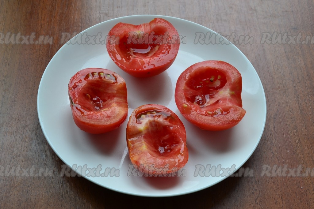 Помидоры разрезать на 2 части. Ложечкой вынуть немного мякоти.