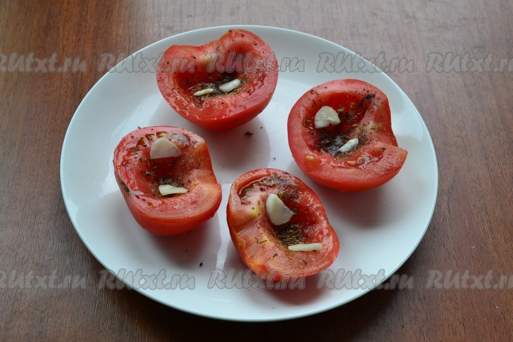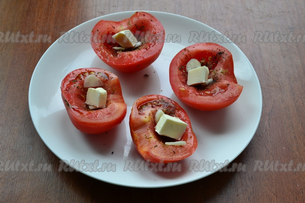 В каждую половинку помидора поместить по кусочку сливочного масла.
