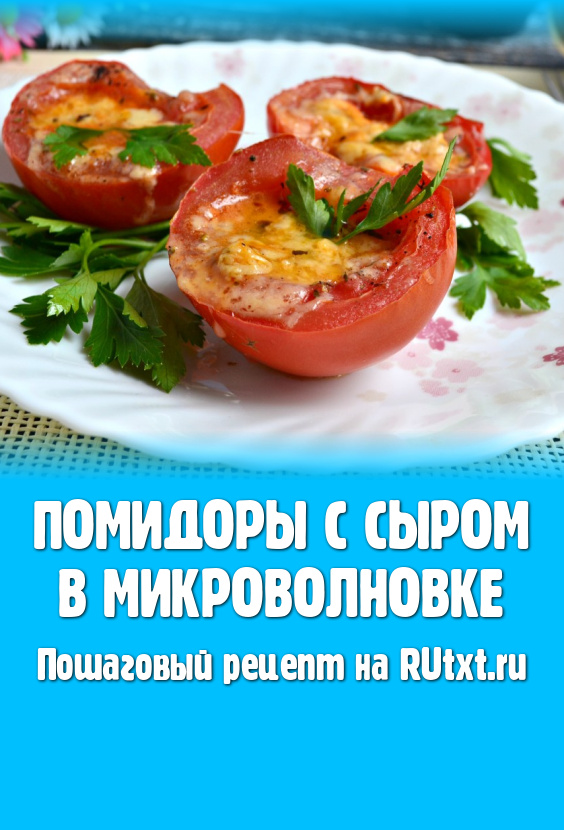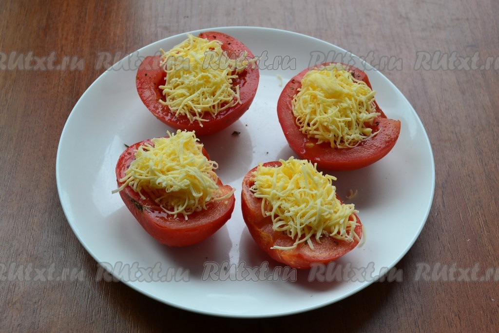 Отправить помидоры в микроволновку на 3 минуты при мощности 750 Ватт. Затем помидоры вынуть, посыпать их тертым твердым сыром.