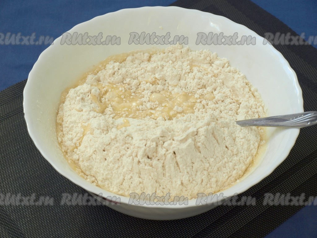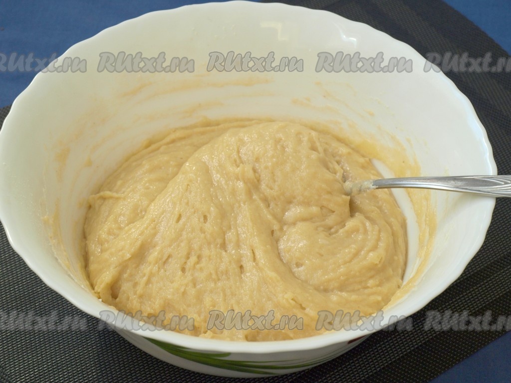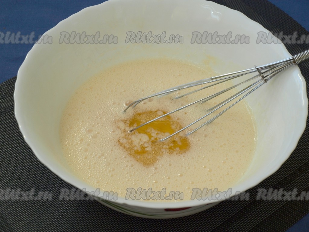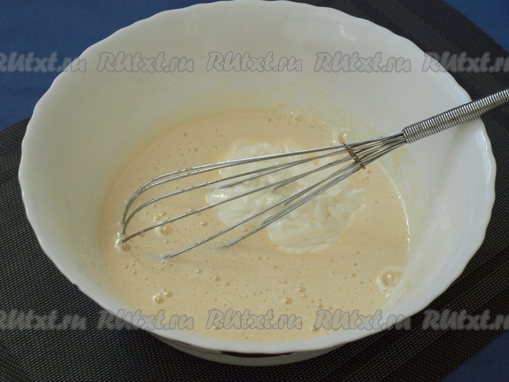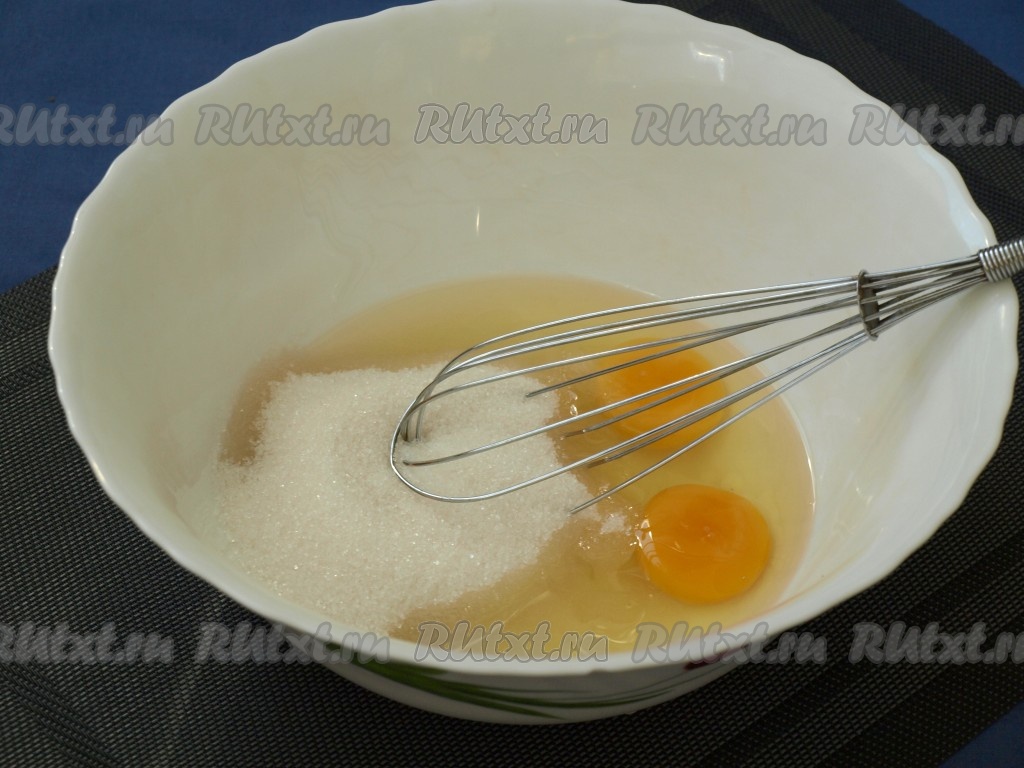 Яйца разбить в глубокую миску, добавить сахар и взбить до побеления массы.