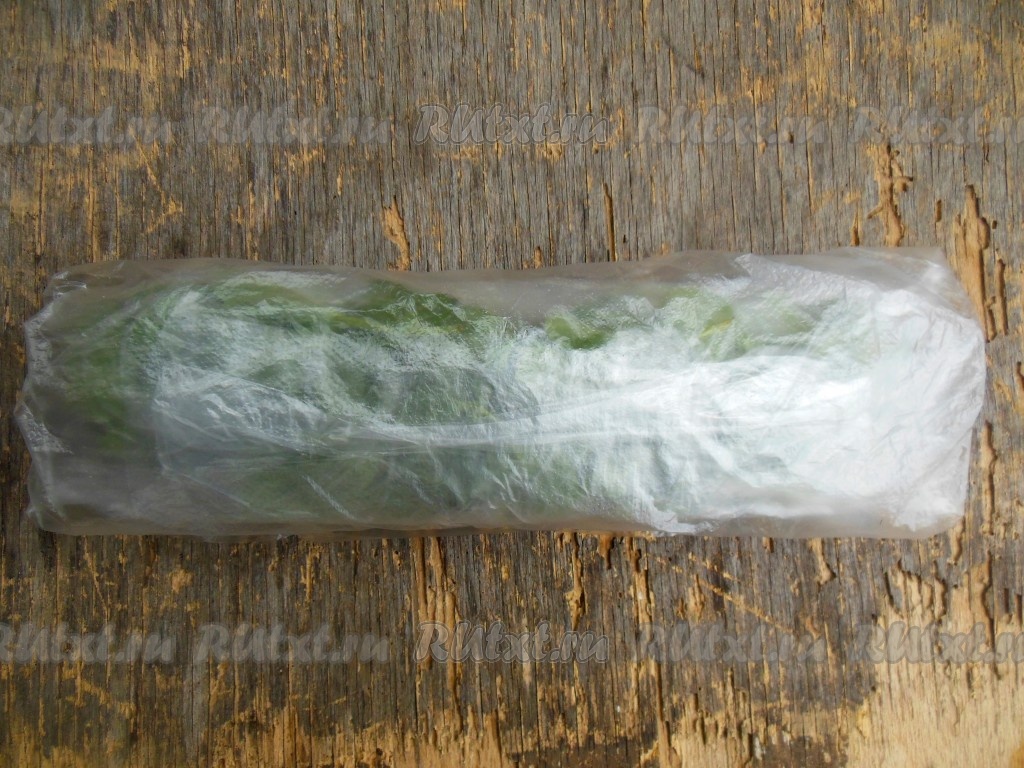 На пищевую пленку или пакет выкладываем немного мяты, сворачиваем первый слой, затем снова кладём мяту, снова заворачиваем и продолжаем выкладывать мяту и заворачивать, пока не закончится пакет.