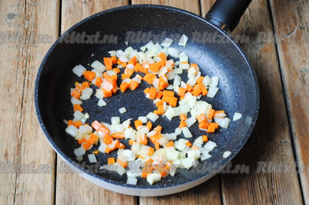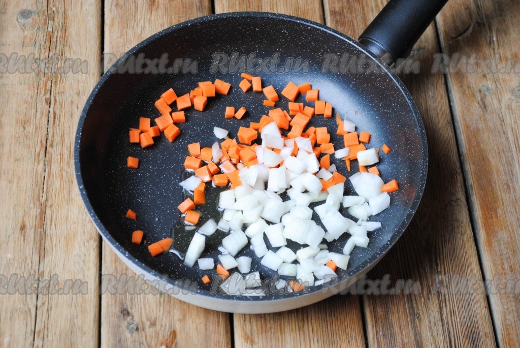 Лук и морковь очистить, нарезать на небольшие кубики. В сковороде разогреть растительное масло и выложить морковку с луком.