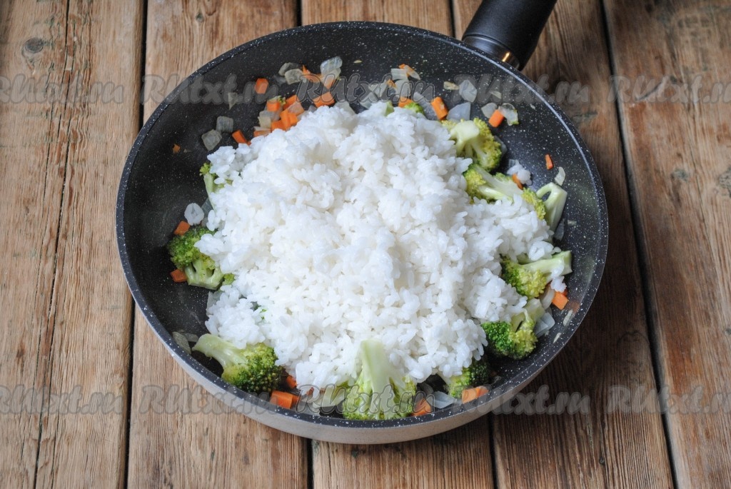 Затем выложить в сковороду брокколи и влить 50 мл воды, посолить по вкусу и готовить 5-7 минут на среднем огне (до полного выкипания жидкости). Крышкой не накрывать.