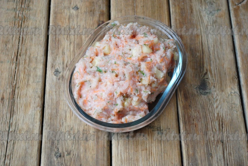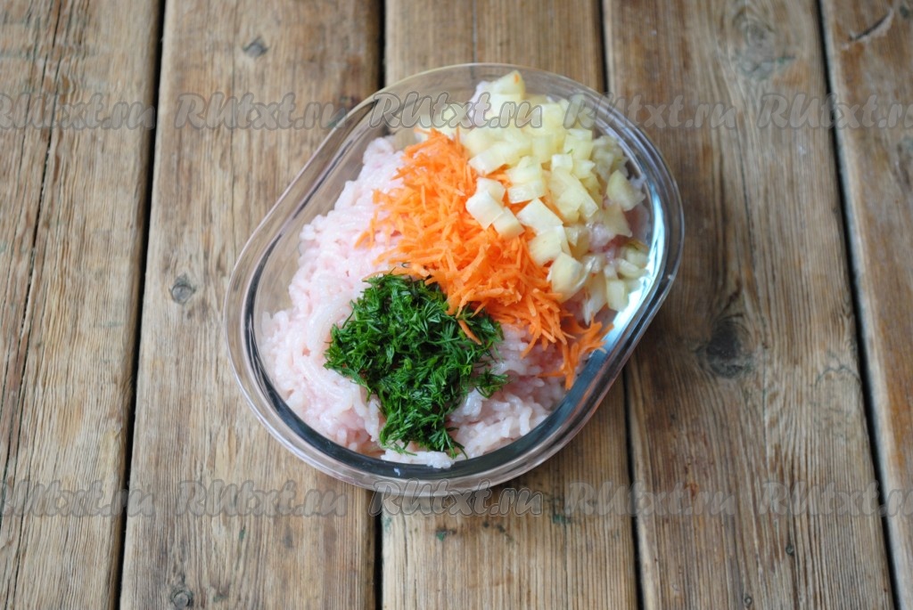 Морковь, болгарский перец и укроп хорошо вымыть. Морковь очистить, перец освободить от семян. Морковь натереть на средней тёрке, укроп мелко нарезать, перец нарезать очень мелкими кубиками. Болгарский перец, морковку и укроп добавить в фарш.