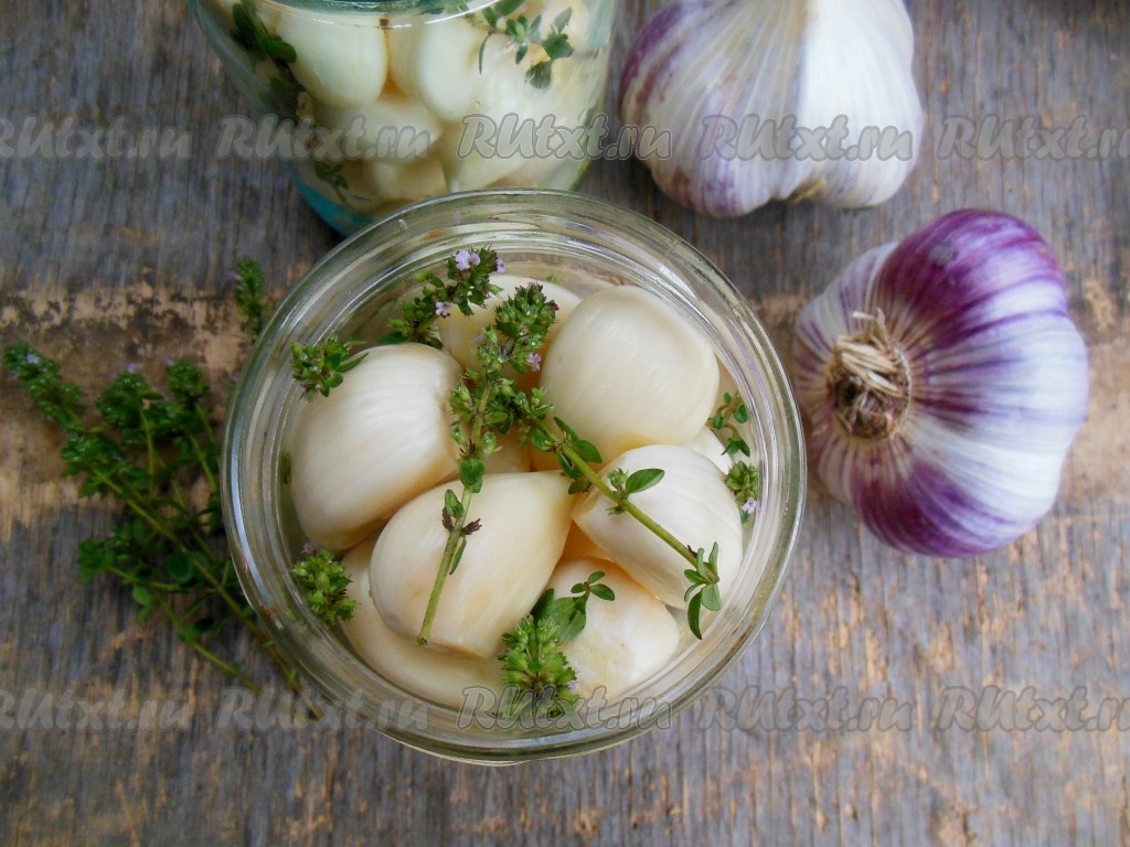 Затем положите очищенные зубчики чеснока, между зубчиками, по желанию, выложите небольшие веточки лимонного чабреца. Вместо чабреца можно взять пару веточек розмарина или использовать сухие прованские травы (по 1 чайной ложке на одну баночку).