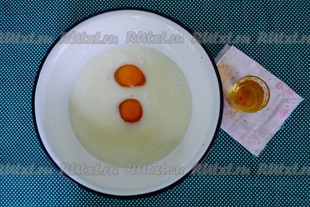 В глубокую миску влить прокисшее молоко, добавить яйца и влить растительное масло.