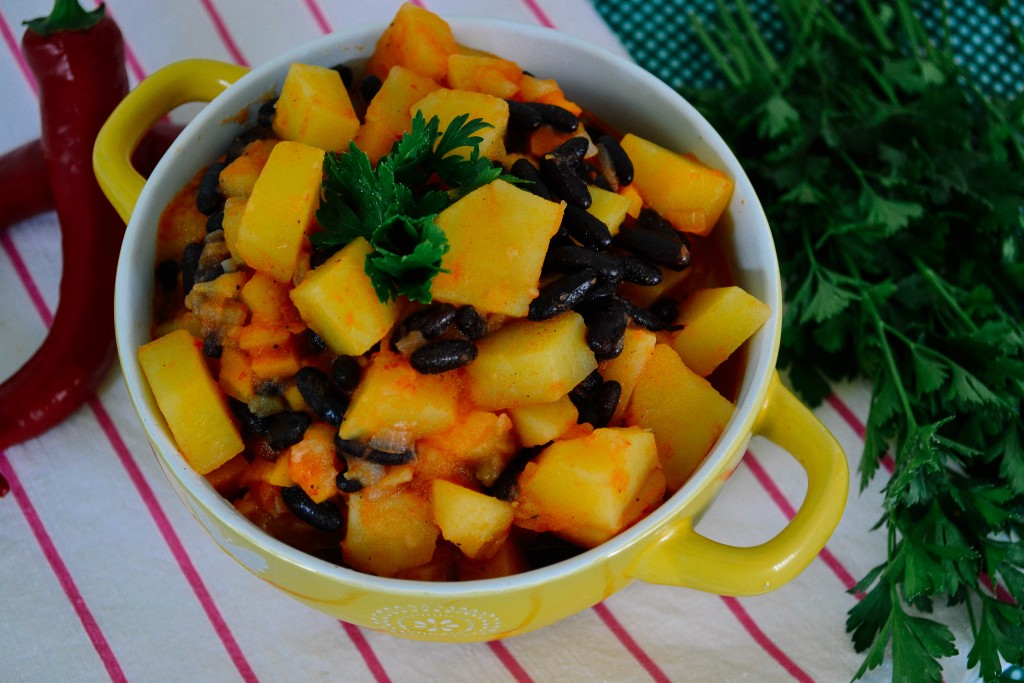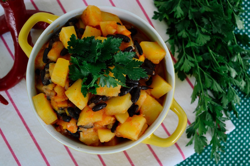 Сытное, вкусное и ароматное блюдо разложить по тарелкам и подать на стол в теплом виде. Тушеная картошка с фасолью будет прекрасно сочетаться со свежими овощами или салатами.