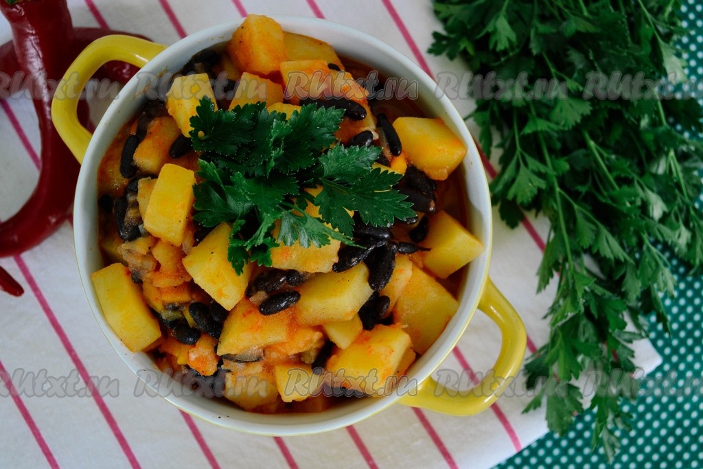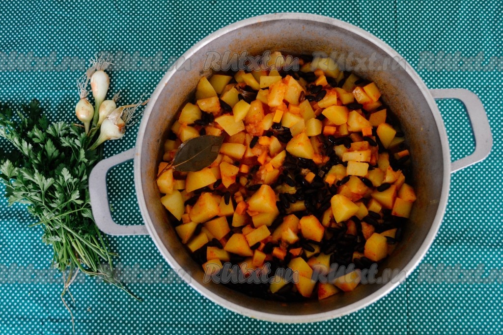 Аккуратно перемешать картофель с фасолью, закрыть крышкой и продолжить тушить еще 10 минут.