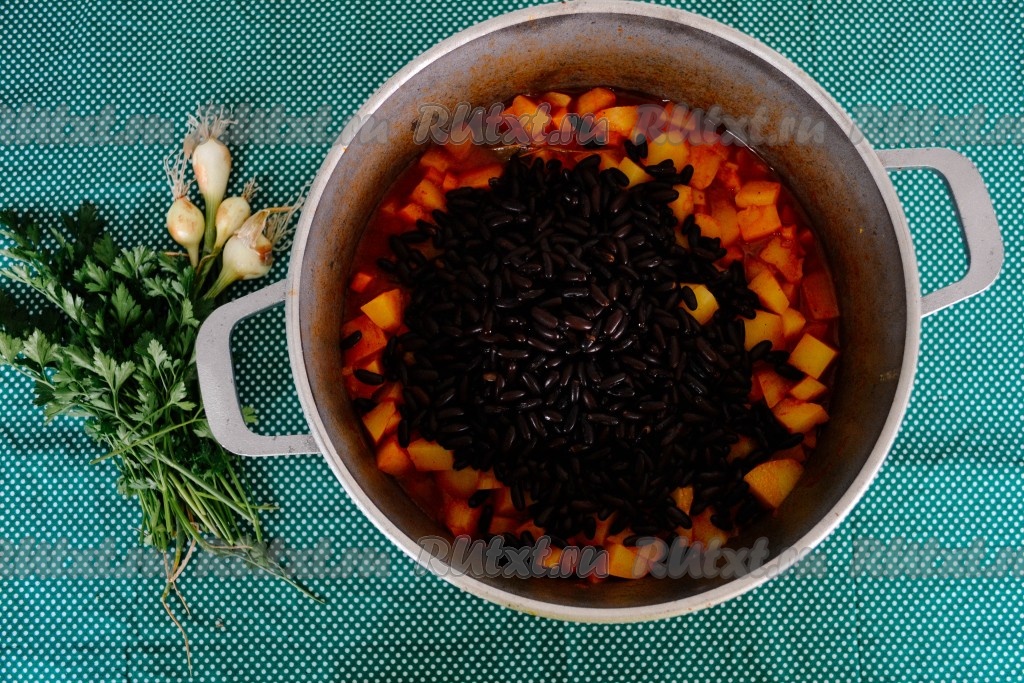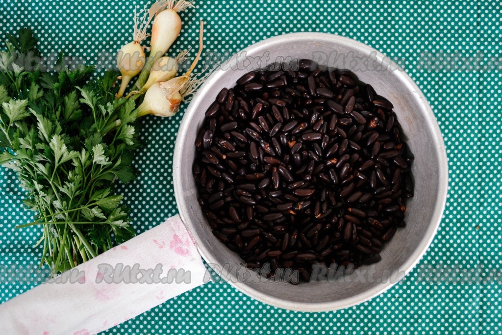 Отварить фасоль, для этого необходимо ее перебрать от мусора и плохих бобов, обильно залить водой и поставить на огонь. В момент закипания снизить огонь к минимуму и продолжить варить до готовности. Время варки будет зависеть и от сорта самой фасоли, и от того, замачивали ли вы ее заранее. Я использовала черную фасоль, варила её 45 минут без предварительного замачивания. А если заранее замочить фасоль в холодной воде на 5-7 часов, она сварится значительно быстрее. Солить фасоль и закрывать крышкой кастрюлю в процессе варки не нужно.