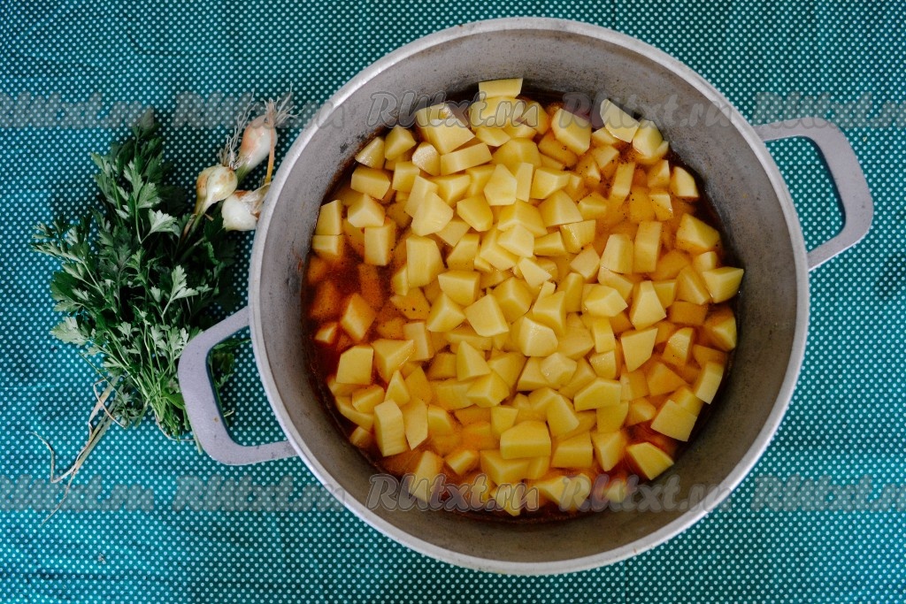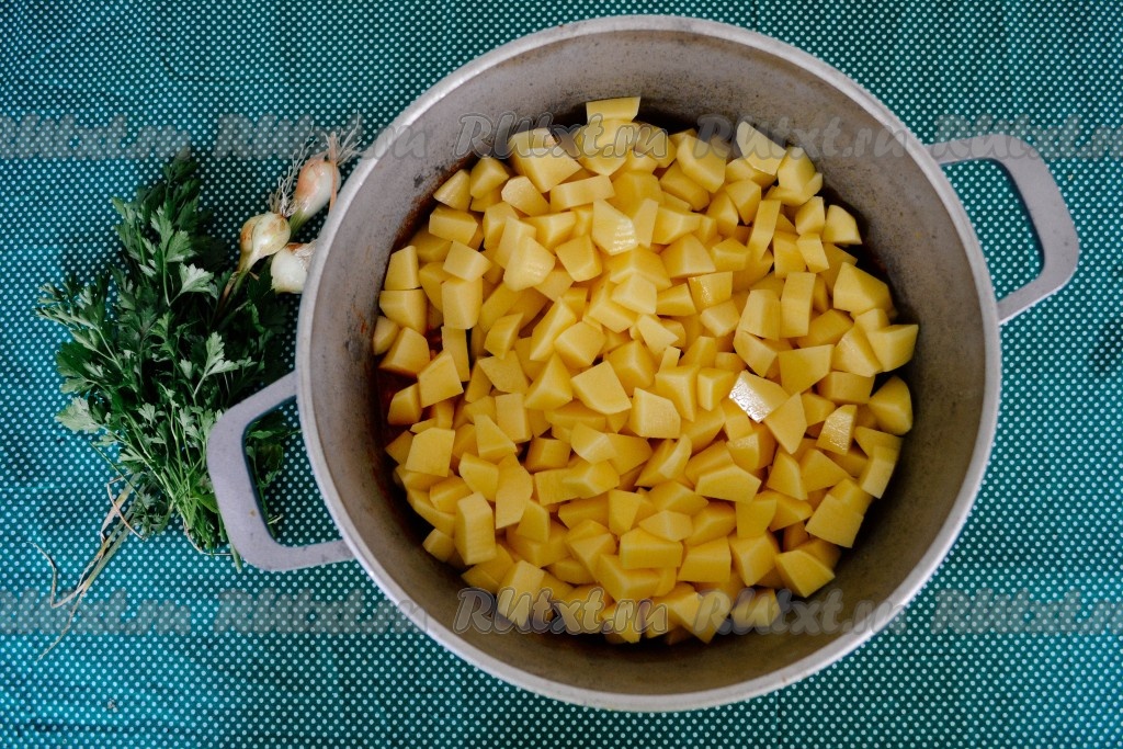 Картофель очистить, вымыть, нарезать небольшими кубиками и добавить в казан.