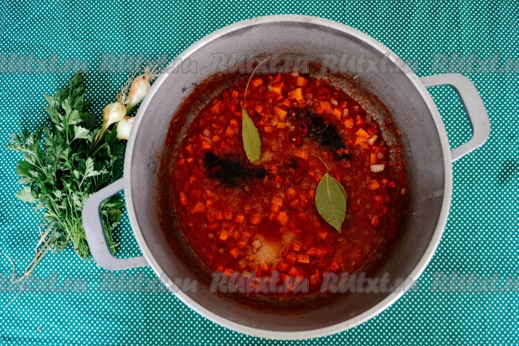 Периодически помешивая, потушить овощи еще 2-3 минуты на слабом огне. Затем всыпать соль, черный молотый перец, добавить лавровые листики и, по желанию, несколько колечек острого перца.