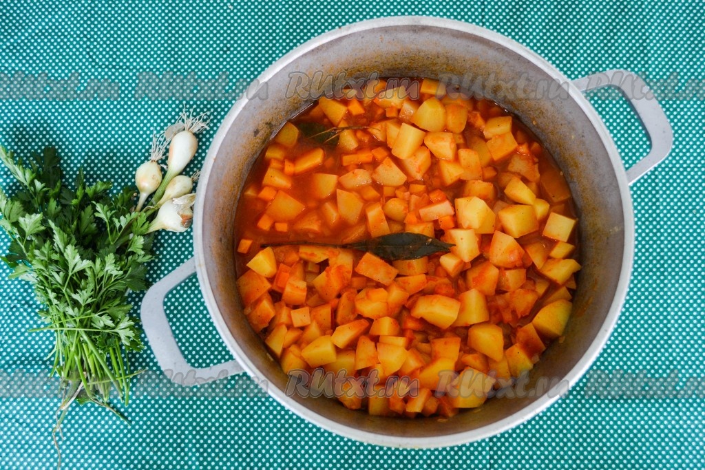 Влить воду, накрыть крышкой и тушить до полного приготовления картофеля.