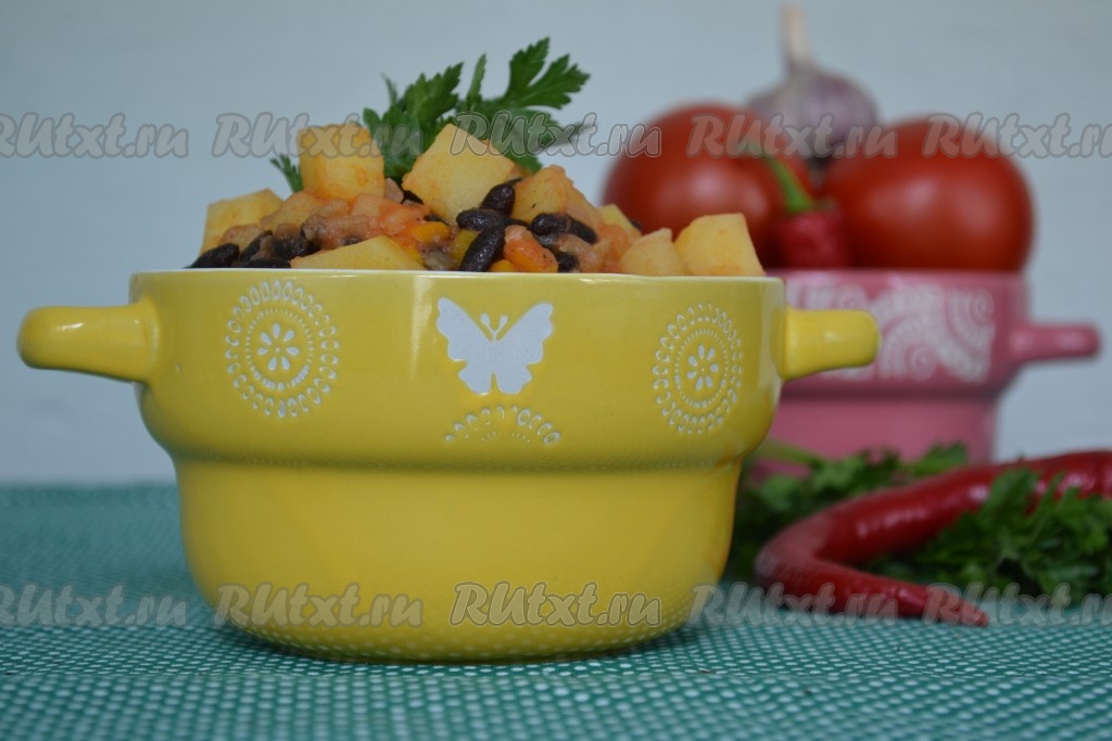 Картофель - это продукт любимый многими. Кто-то любит его жареным, кто-то просто отваривает в мундирах, а вот мой муж обожает его в тушеном виде. И мне нравится тушеная картошечка, особенно за легкость приготовления: сложил все ингредиенты и оставил готовиться. Сегодня сделала это блюдо не как обычно: мясо заменила фасолью. Сочетание нежной, мягенькой, ароматной тушеной картошки с фасолью - великолепное! Обед получился не только очень вкусным, но и достаточно сытным.