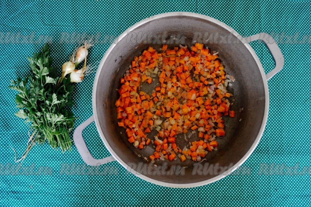 Лук и морковь очистить, нарезать мелкими кубиками. В казан или толстостенную кастрюлю влить растительное масло, включить огонь, а через минутку всыпать нарезанные лук и морковку. Обжарить 2-3 минуты на слабом огне, иногда помешивая.