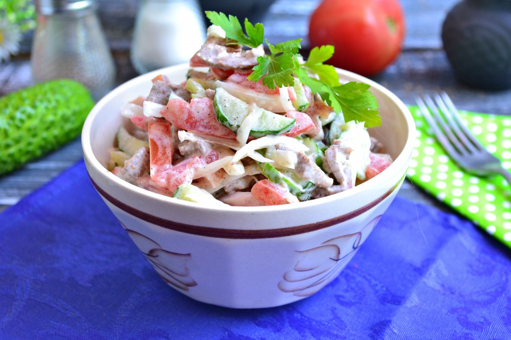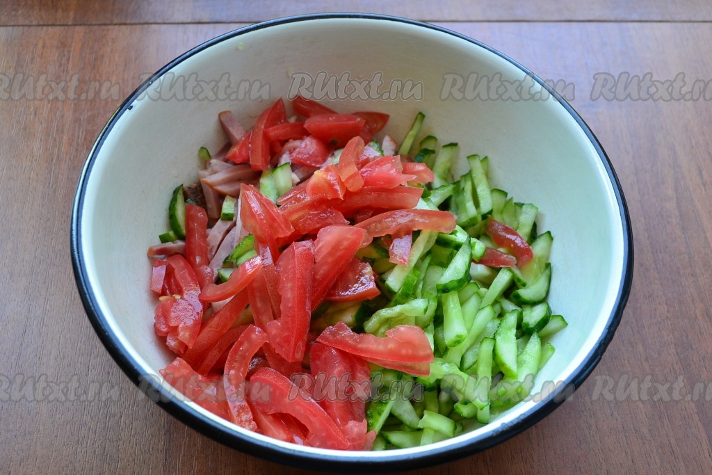 Огурцы отжать от жидкости и добавить к мясу и ветчине. Помидоры разрезать на 2 половинки, удалить мякоть и нарезать соломкой. Добавить помидоры к остальным нарезанным продуктам.