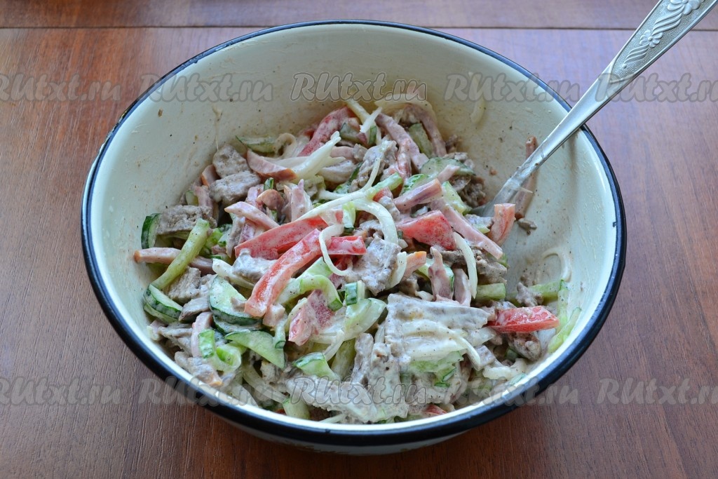 Добавить в салат немного майонеза и аккуратно перемешать.